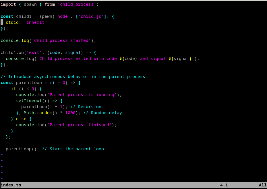 - We define a parentLoop function that simulates asynchronous behavior in the parent process. It runs a loop with a random delay between iterations, logging "Parent process is running" until it has executed 5 iterations, after which it logs "Parent process finished".